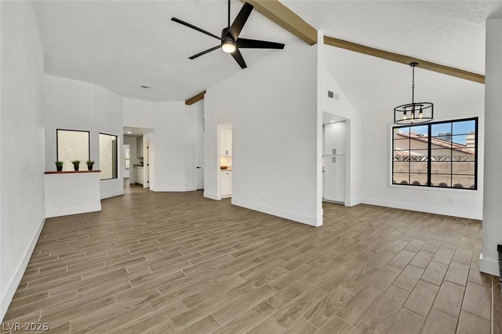 You don't come across a home like this often! Stunning Spanish-style residence featuring vaulted ceilings, exposed wood beams, and a unique central atrium that fills the home with natural light. The remodeled kitchen offers white cabinetry, granite countertops, stainless steel appliances, double ovens, cooktop, and microwave, all complemented by wood-look linear tile flooring throughout. The spacious primary suite includes a beautifully remodeled bath with vessel tub, double sinks, and an organized walk-in closet. A large secondary bedroom also features a walk-in closet and access to an updated bathroom. Additional highlights include a laundry room with extra storage, 2-car attached garage, and French doors from the nook leading to a generous backyard with patio space. Located in a gated, intimate community with a community pool.